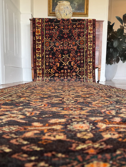 Vintage Midnight Garden Runner 3’ x 13’4 | Circa 1940–1960 | Hand-Knotted Wool