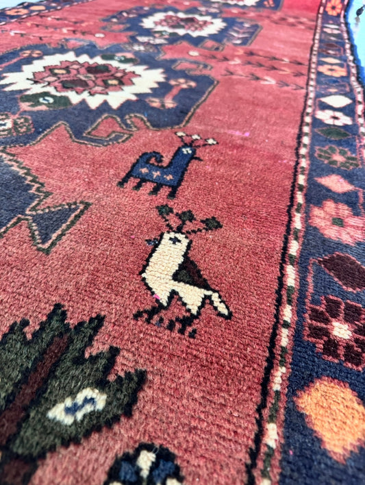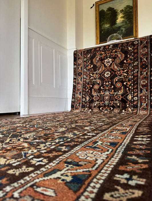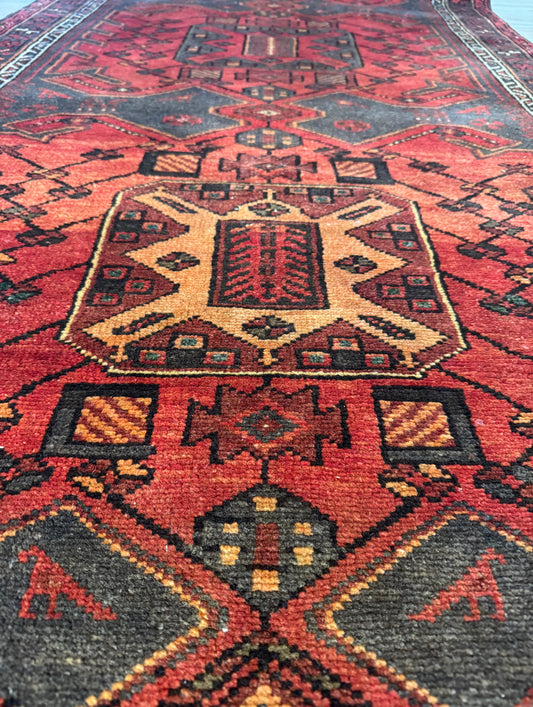 Vintage hand knotted veggie dyed Herki runner 4’6” x 12’10”