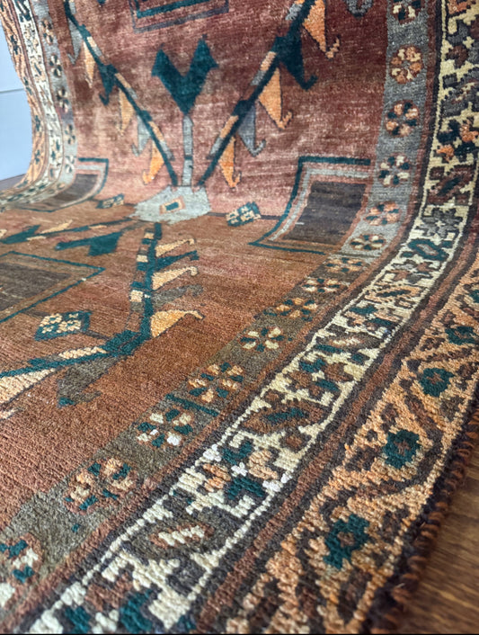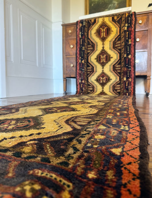 Vintage hand knotted veggie dyed Herki runner 4’6” x 12’10”
