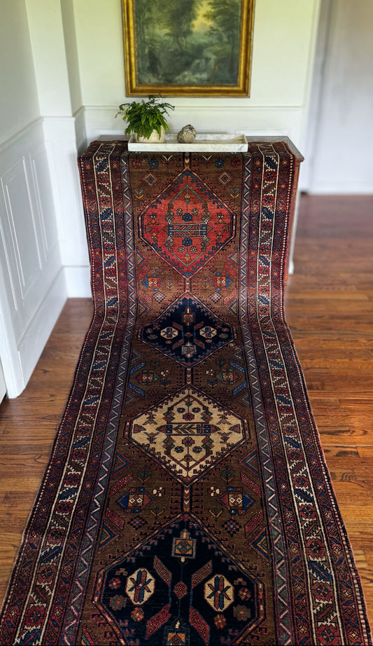 Antique Malayer Tobacco Ember runner 3’6” × 10’1” — Circa 1915–1930