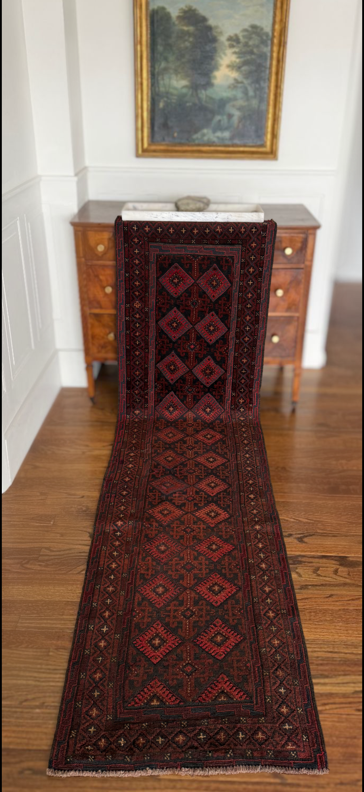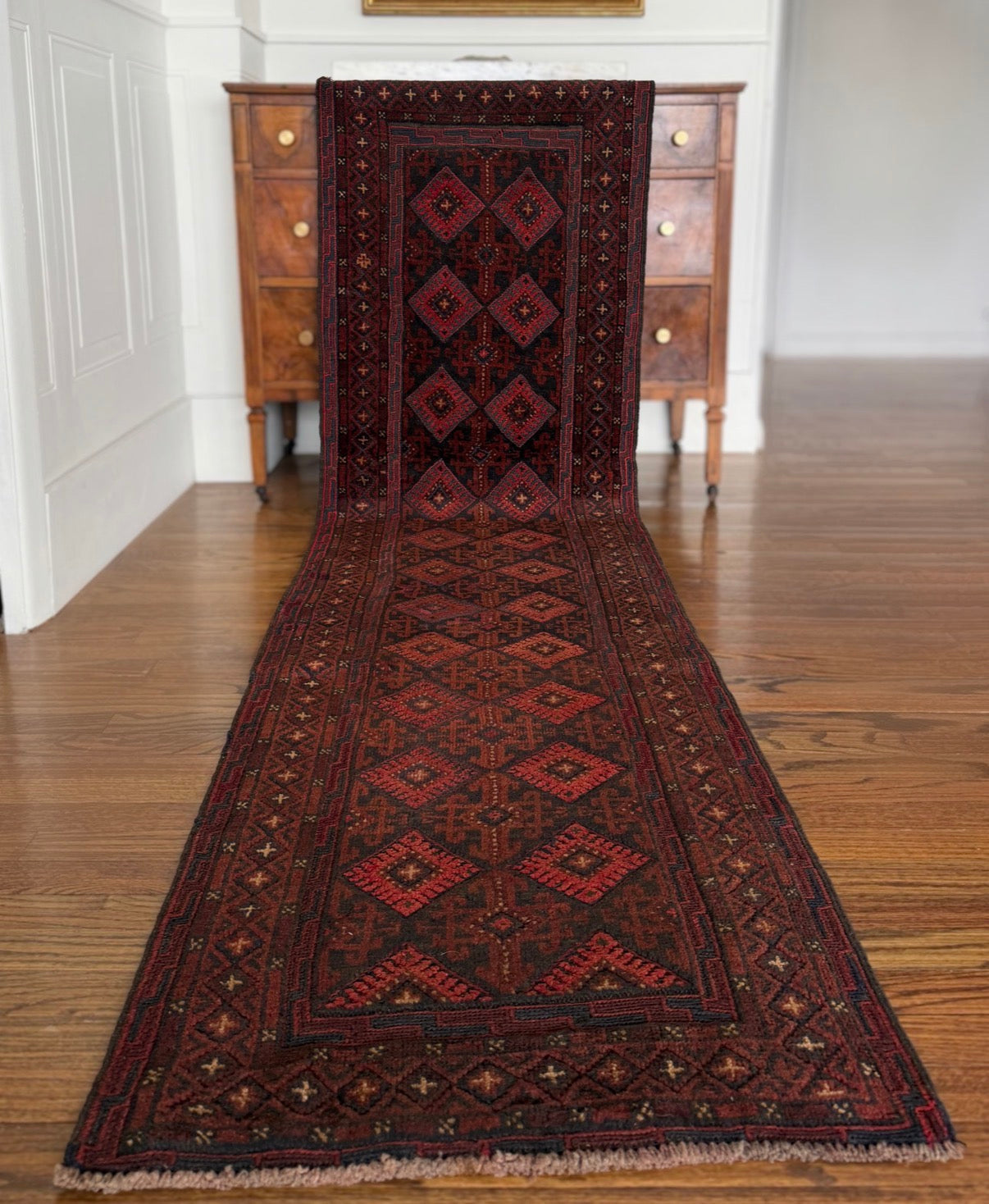 A richly saturated Afghan Baluch runner featuring repeating diamond medallions in deep oxblood, ember red, and charcoal. The elongated field is framed by intricate tribal borders that create strong linear movement. The darker palette and compact weaving give this piece architectural presence, making it ideal for hallways, kitchens, or grounding lighter interiors.