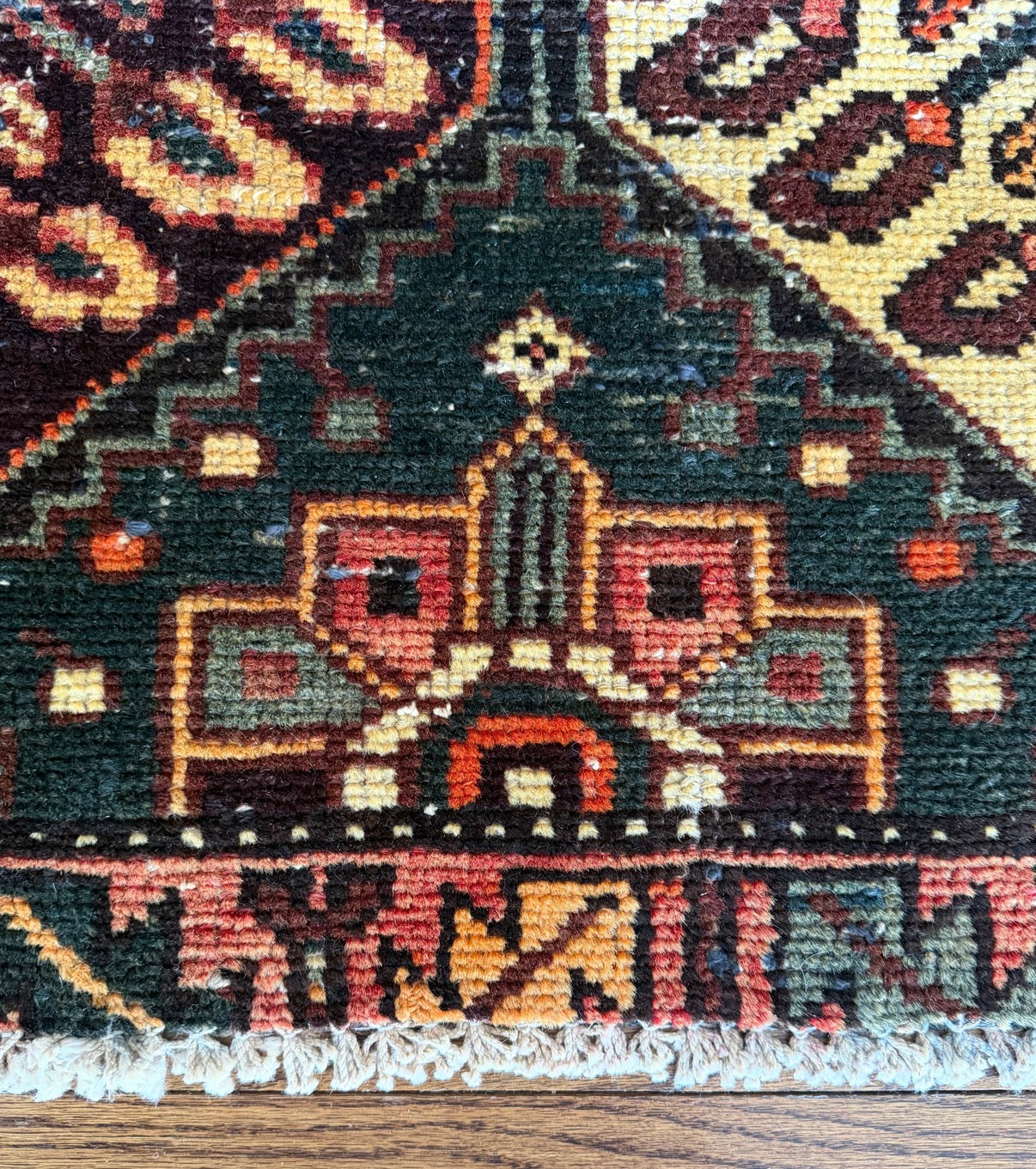 A richly detailed Northwest Persian village rug featuring bold diamond medallions anchored by stylized botanical motifs. Deep forest green, cream, and oxblood tones create strong contrast, while the angular border work adds graphic structure.