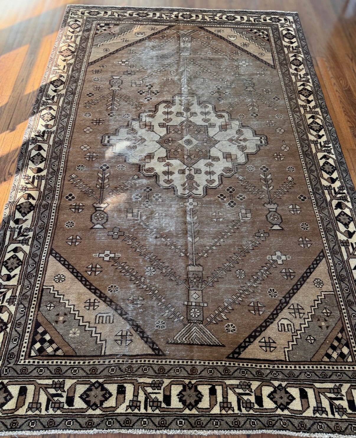 Handwoven in the mid-20th century (circa 1950s–1960s), this vintage wool rug features a grounded, earthy palette of warm camel, taupe, espresso brown, and soft ivory. The geometric field and symbolic border motifs give it a strong, masculine presence while still feeling timeless and livable.